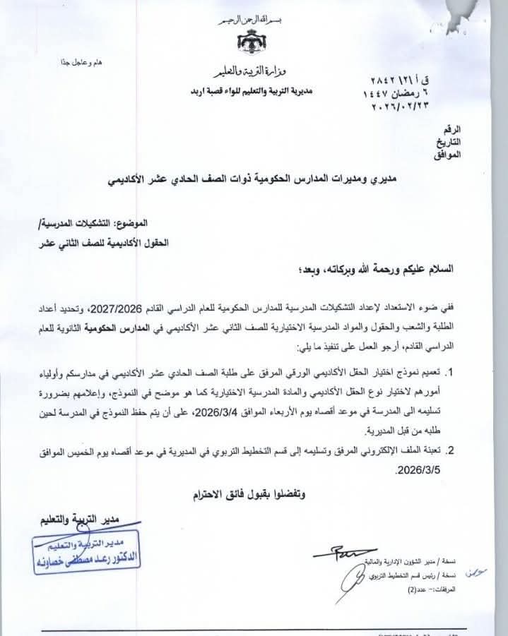 يوزع طلبة الصف الحادي عشر لجيل 2009 على 4 حقول وهي: